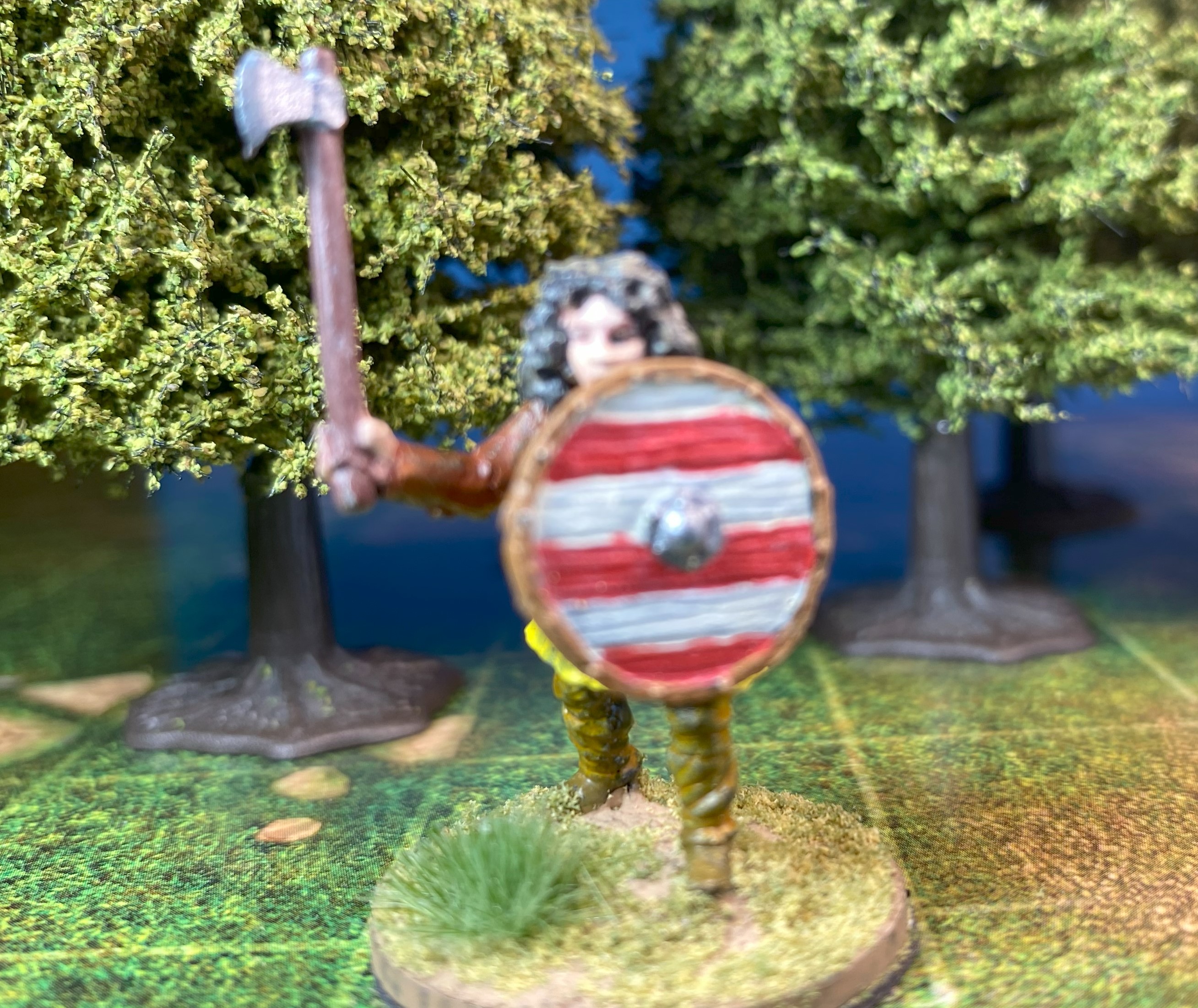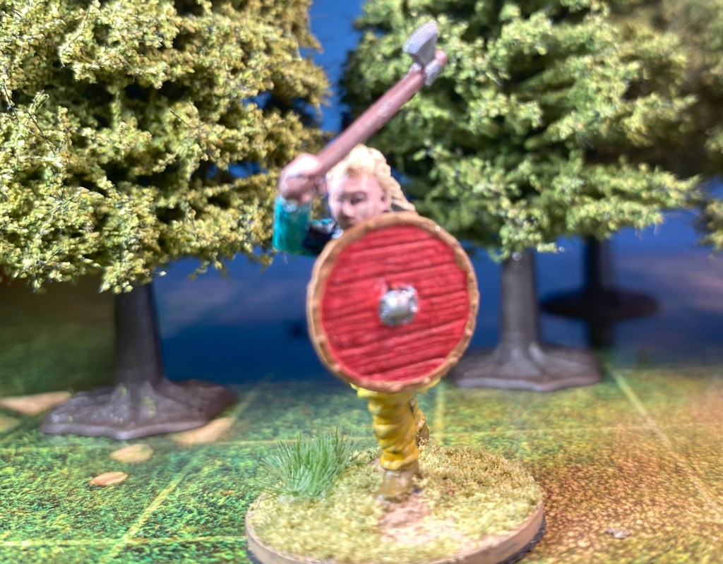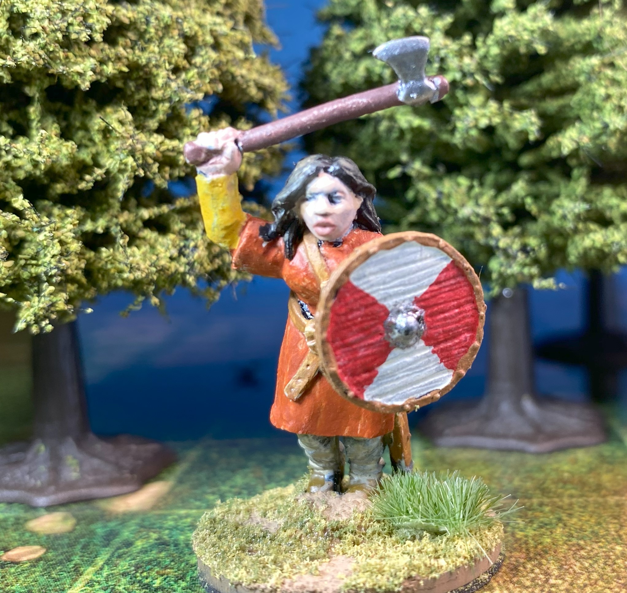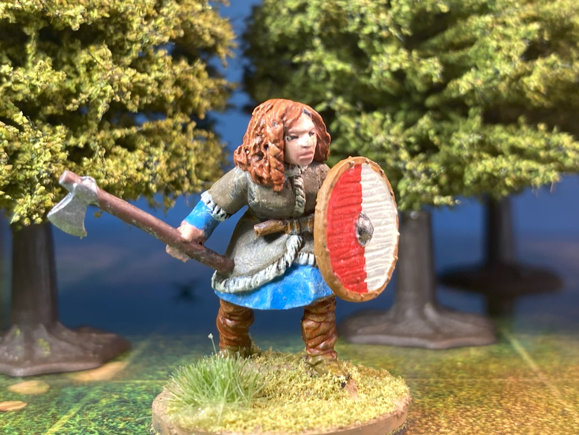I like the Bad Squiddo shield maidens. They are female without being scantily clad or oversexualized. They look rather like ladies I’ve gone to school with or worked with. The one you painted with a red and white striped shield has frizzy, brown hair, rather like my wife (though hers has a lot of grey mixed in nowadays).
