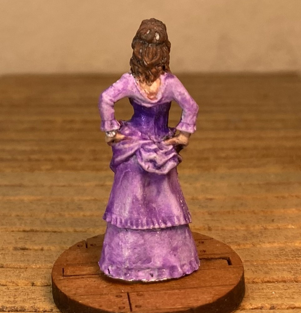 The sculptor didn’t use any photographs of Fannie Porter in sculpting the figure. Instead, he sculpted a soiled dove and gave her the name Fannie Porter. He uses the same dress design on several dance hall/saloon girl minis. The closing decades of the 19th century and the opening decades of the 20th century saw an explosion of color in new colorfast dyes, so I chose to paint her dress purple as the color purple was no longer just for the wealthiest people.