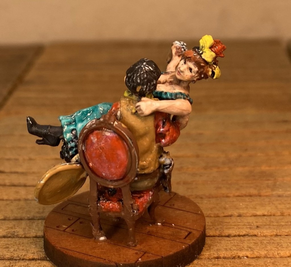 The last figure in the Scarlet Ladies pack is a dance hall girl in a cowboy’s lap. You can buy all of the figures in the pack individually but are a little cheaper if you buy the pack. I mention this because I bought this figure before the pack came out and it is slightly different from the figure in the pack. The figure in the pack is seated on an oval chair like you would find in a home, while the individual figure is seated on a chair you would find in a saloon.