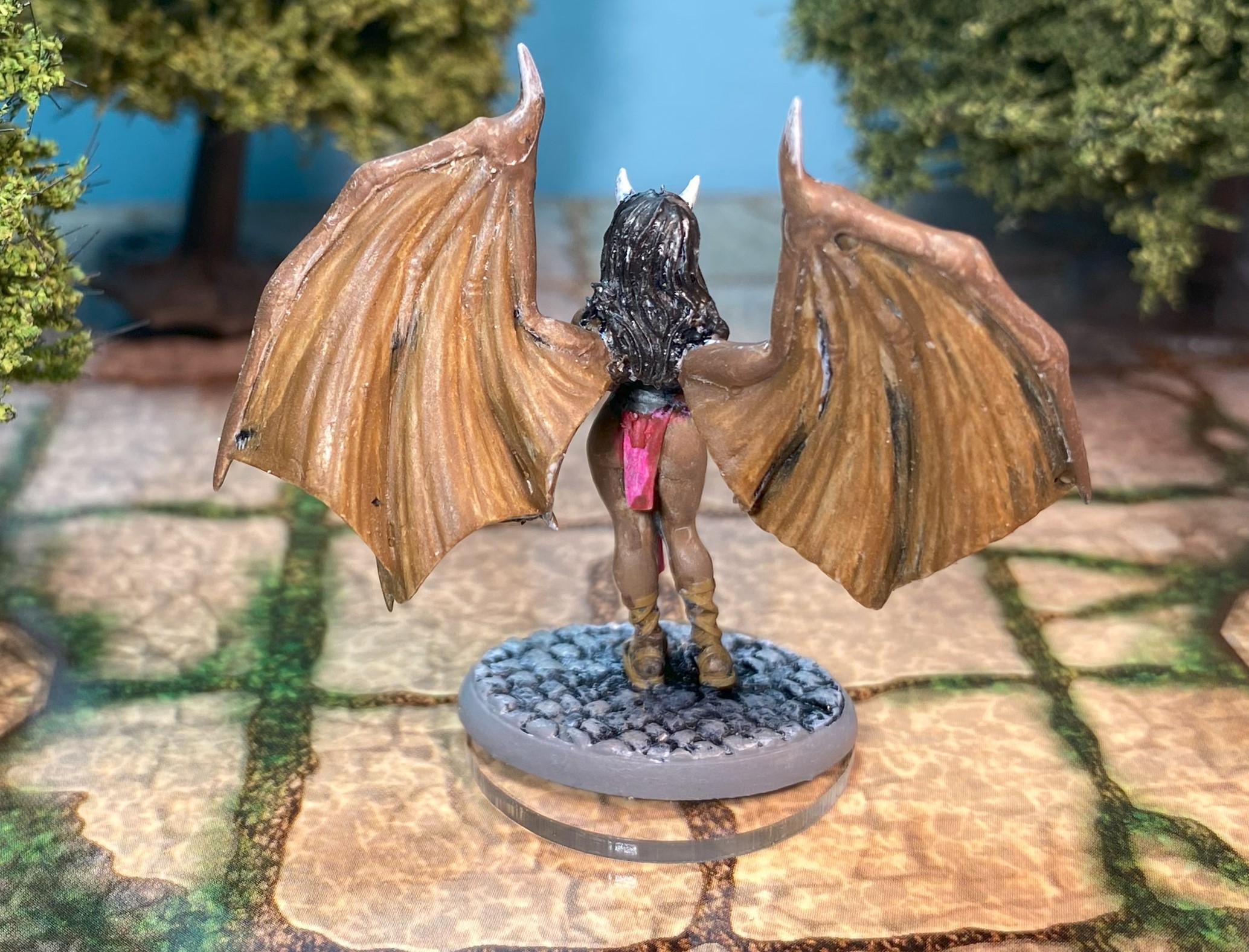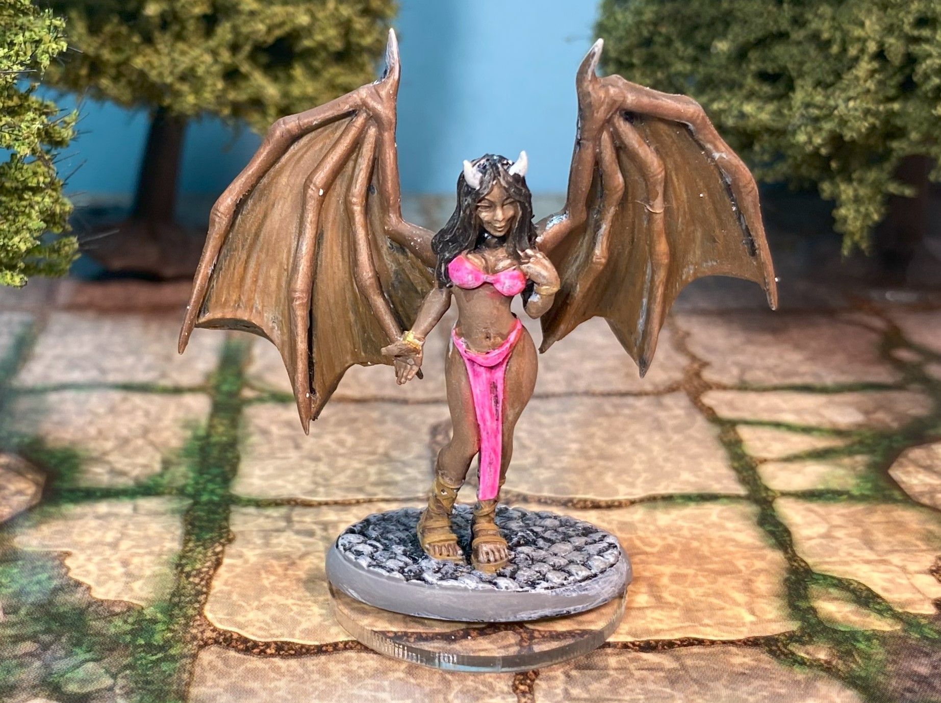 This delightful figure is from Reaper’s Bones Black range, and she really was fun to paint. Not only would she be a demon in WHAT, but she could also be used as a Bat-Winged Bimbo from Hell character in the old Macho Women with Guns game.