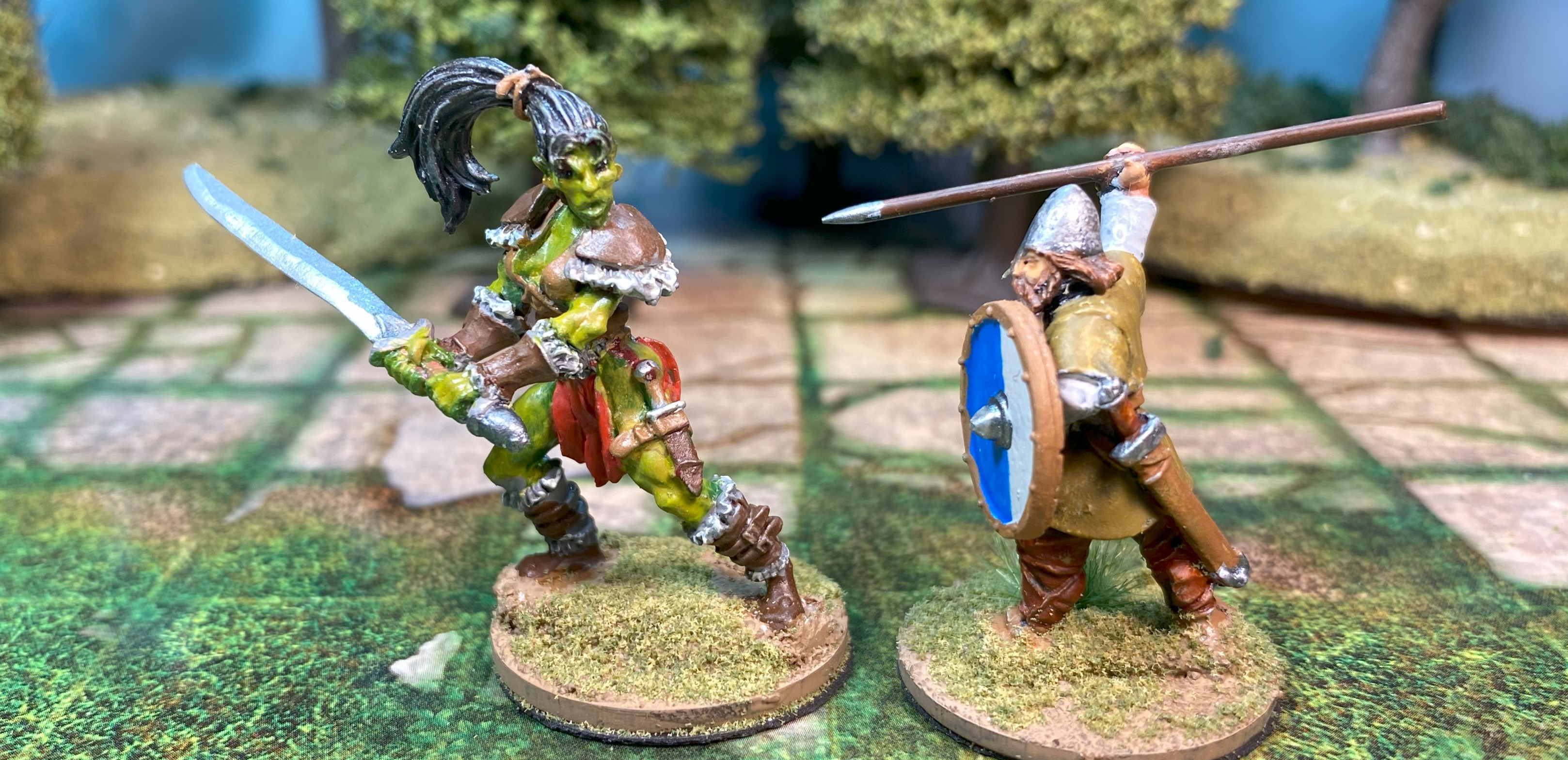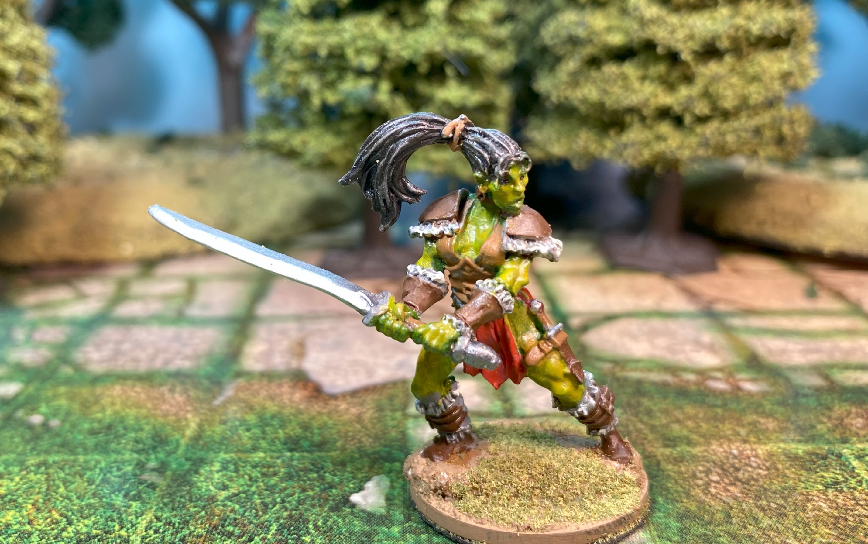 During Orctober, I only painted one orc, well, half-orc. Wielding a double-handed great sword is Lathula from Reaper Miniatures. She’s not quite as green as other orcs and goblins I’ve painted. The reason for that is that I’m starting to integrate more of a Robert E. Howard’s Hyborian vibe into my games. While there are no orcs per se in Howard’s Hyboria, there are devolved or degenerate races of men who fit the description of orcs. Therefore, I’m going to start working for a human skin tone with a tint of green for my orcs. Lathula can be either a human barbarian as well as a half-orc, but this muscle mommy is taller than most 28mm human males.