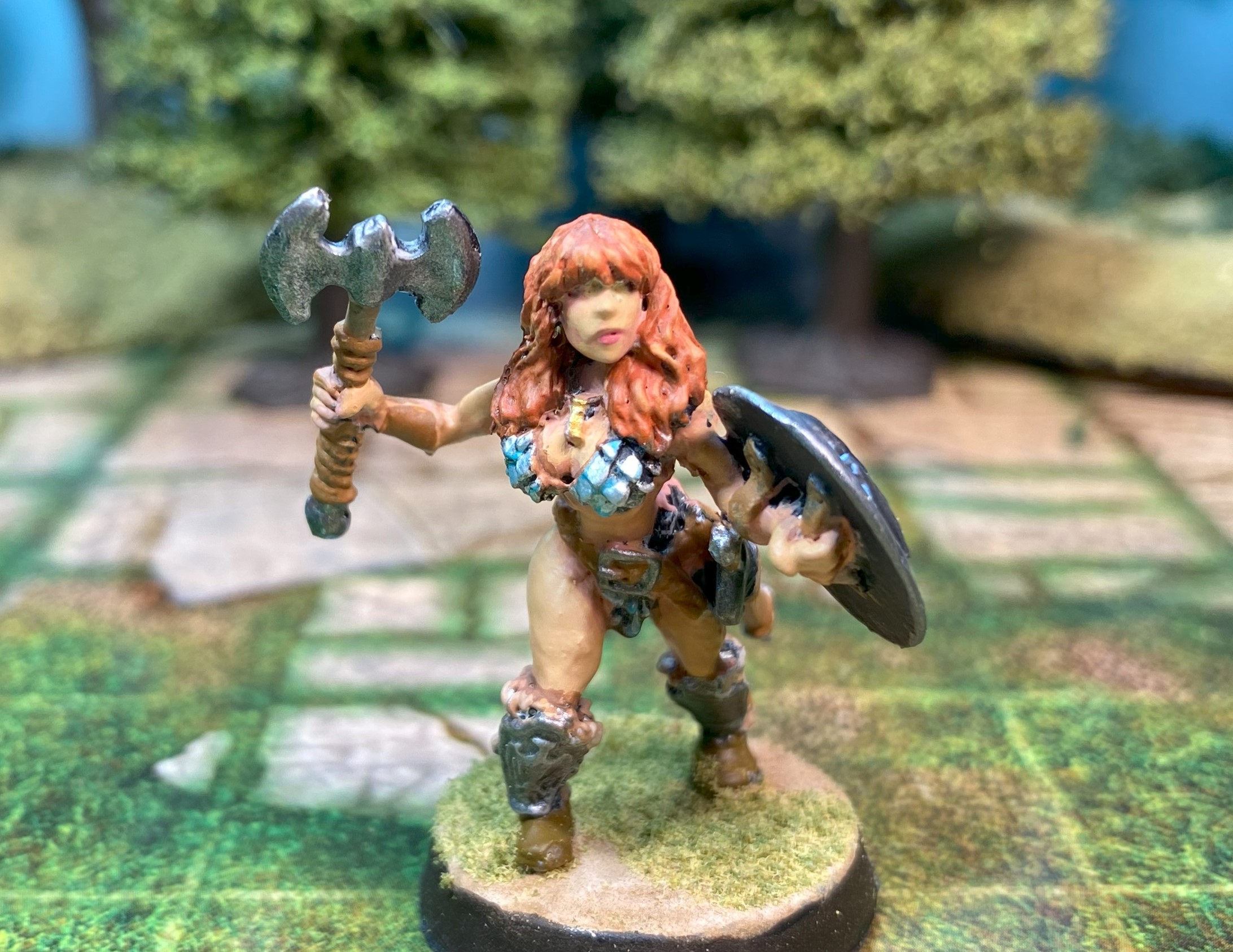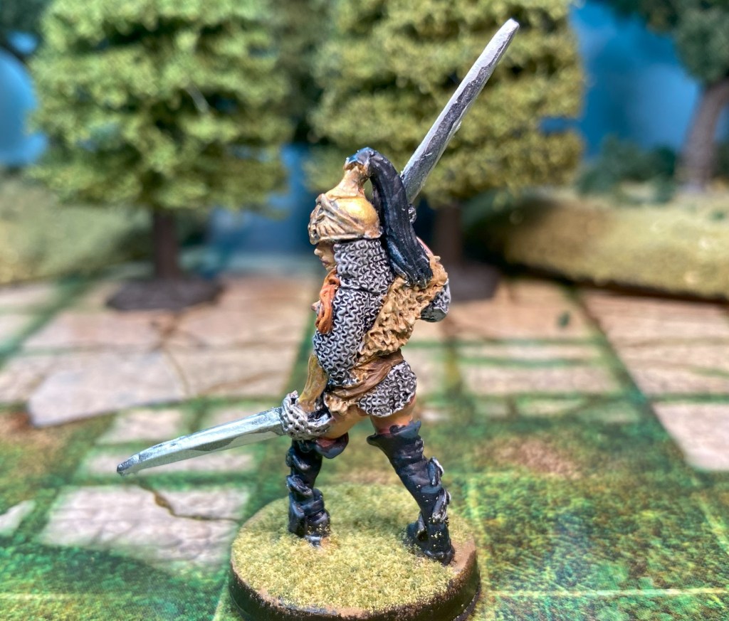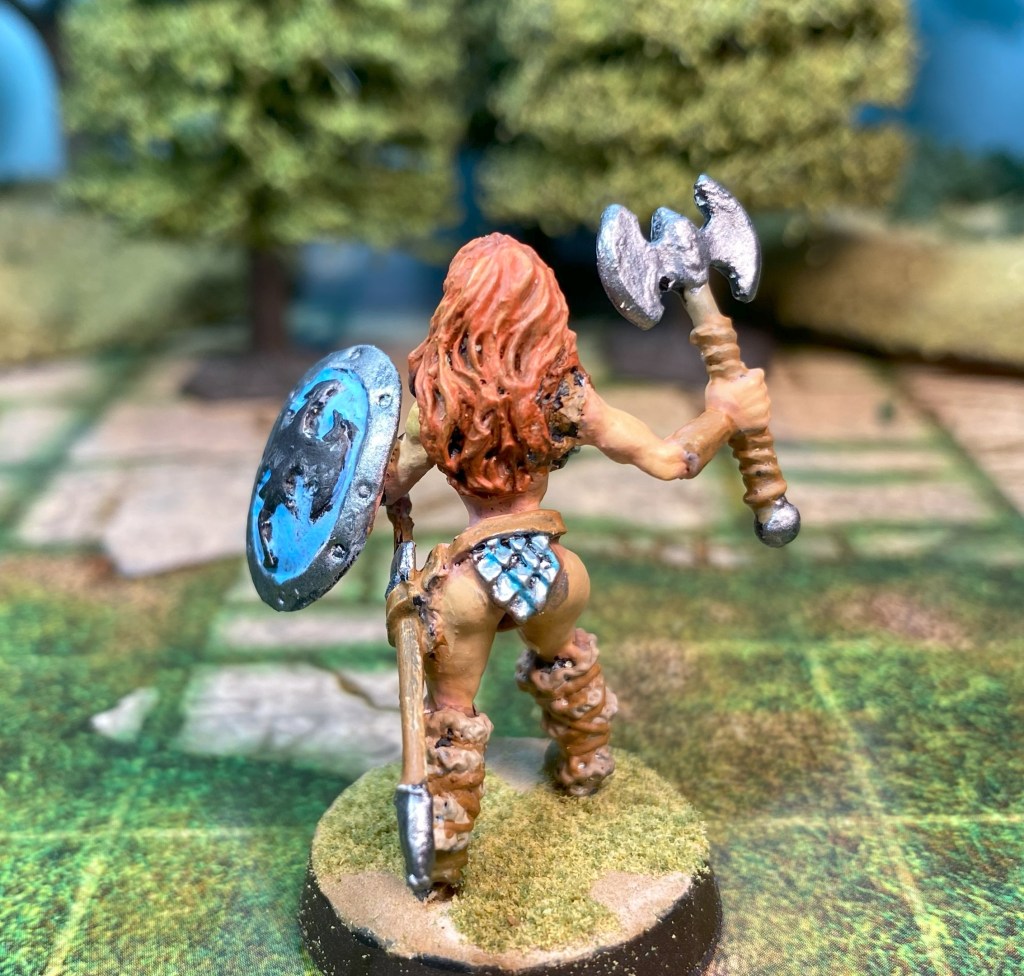 These figures are from Bronze Age Miniatures, the Barbarian and Northmen ranges. I had bought 28mm female barbarians and gladiators in the past, but the sculptor has replaced the older sculpts with 32mm figures. After purchasing one of the 32mm figures a couple of years ago, I decided she was too big and put her in the bits bin. I’ve been experimenting with different techniques to achieve better skin tones, so I pulled her out to paint and discovered 32mm isn’t much larger than today’s 28mm which are actually 30mm. So, I ordered a few more to paint.