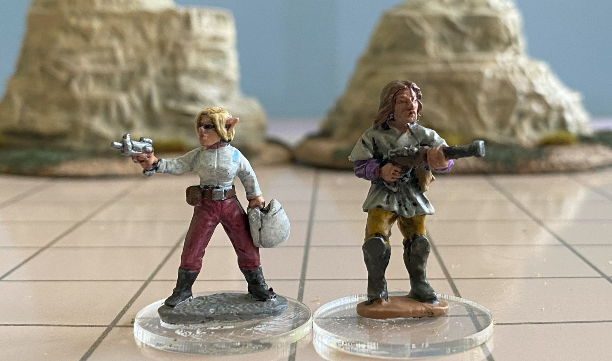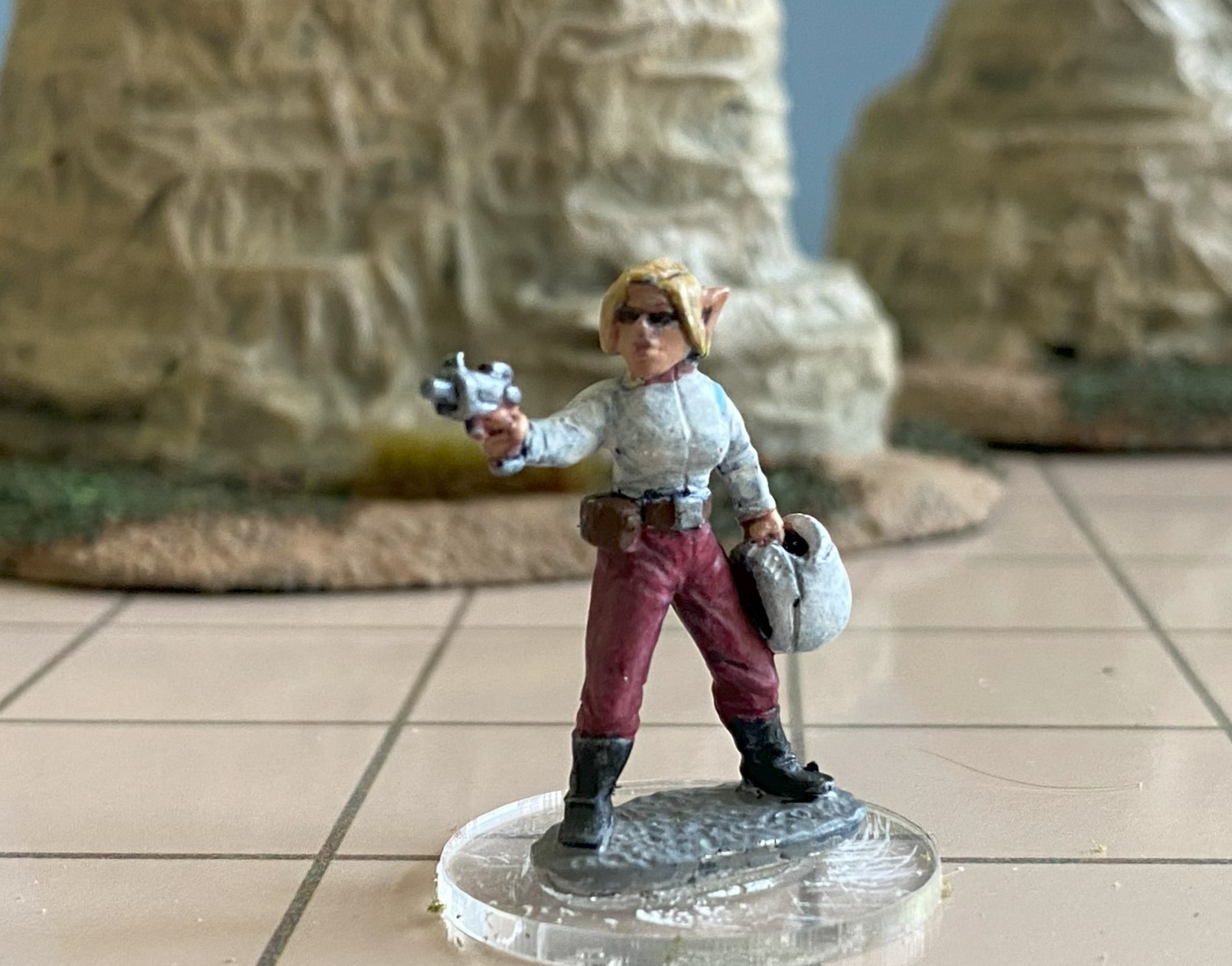 And finally, I painted two sci-fi characters, a space elf from Hasslefree Miniatures (I think) and one I bought from Annie’s bargain basement at Bad Squiddo Games.